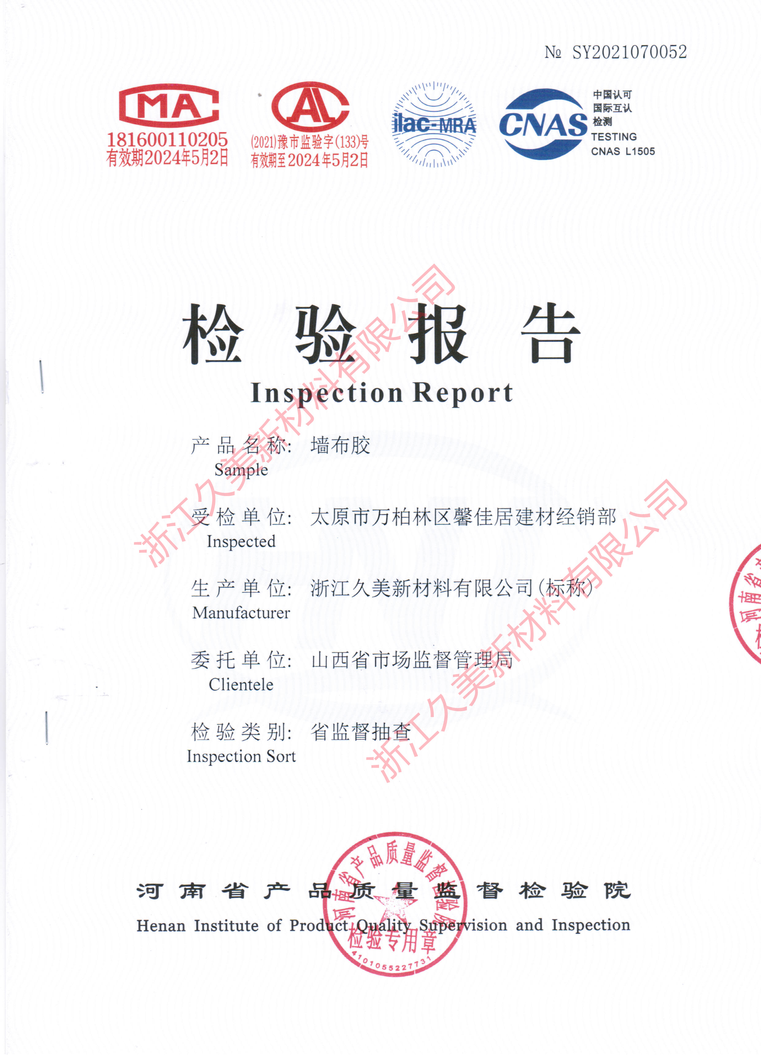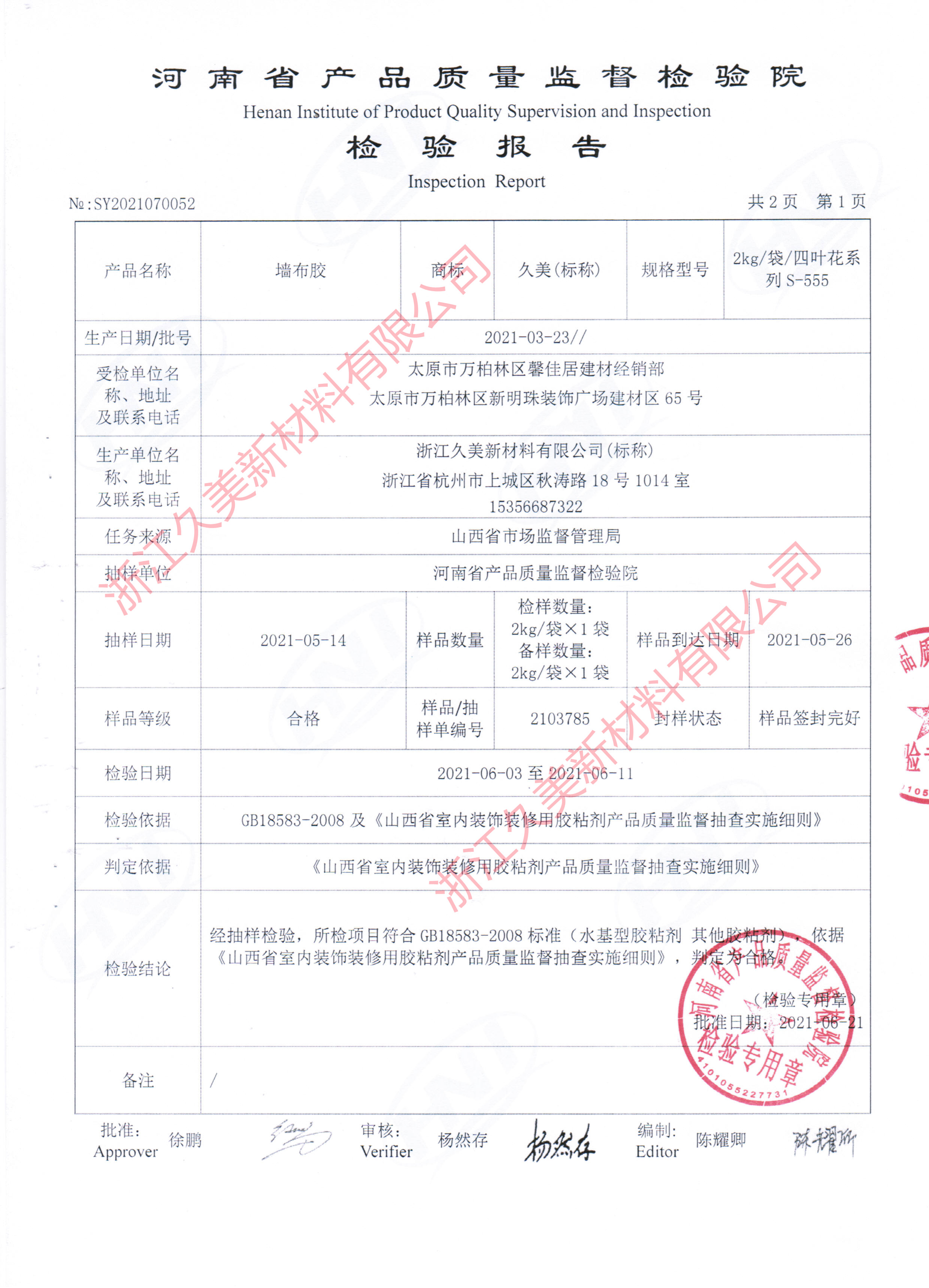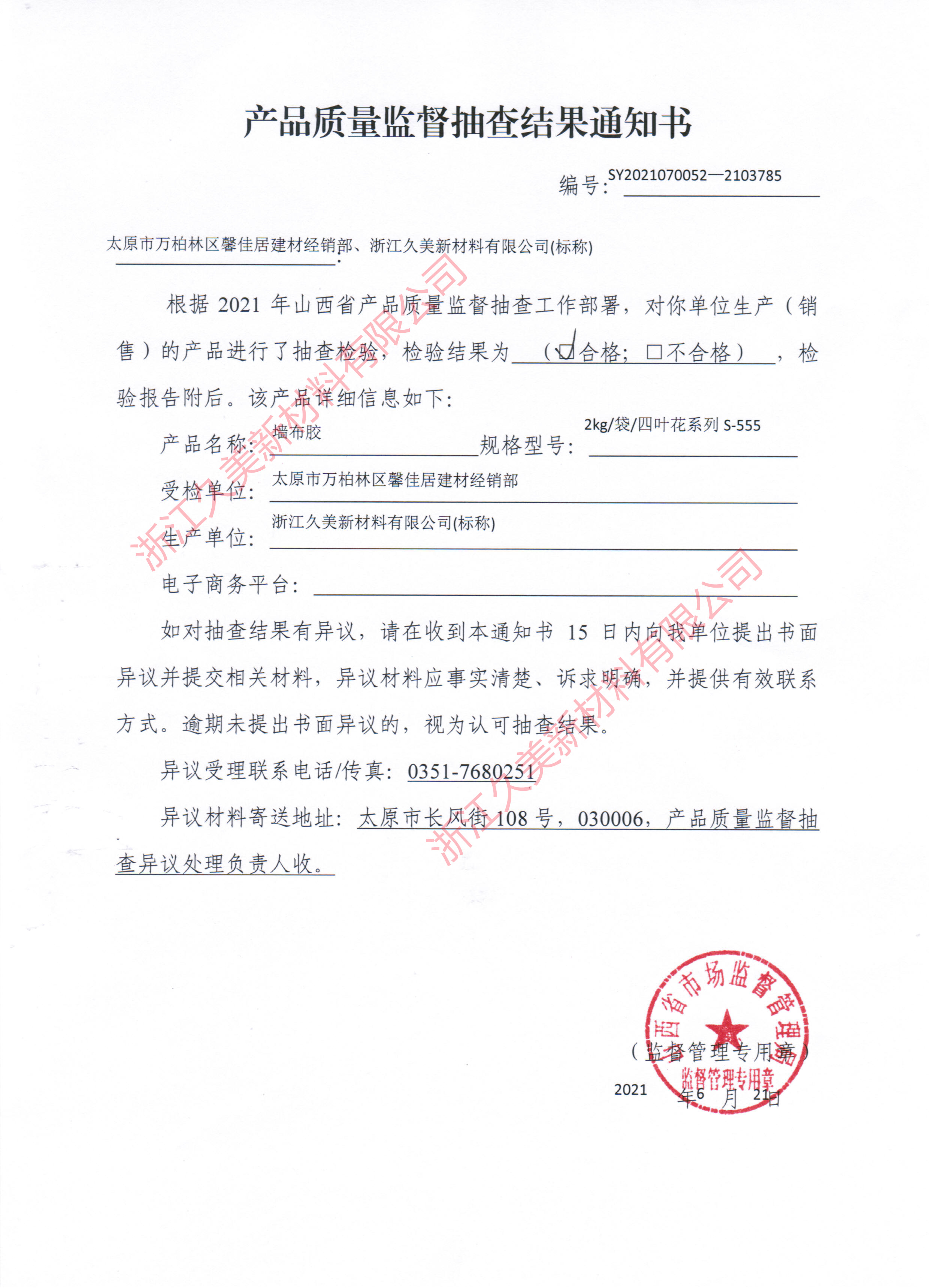2021年3月份山西省市场监督管理局对太原地区建材市场进行了抽样调查,其中我司的四叶花S555系列糯米胶也在随机抽检范围,经山西省市场监督管理局的严格检测,以及反馈回来的信息,我司S555系列糯米胶抽检项目均优于行业及国家标准,浙江久美郑重承诺:我司生产的糯米胶、墙基膜、瓷砖背胶等产品均符合行业标准及国家标准,请广大代理经销商和用户放心选购。(具体抽检报告如下):